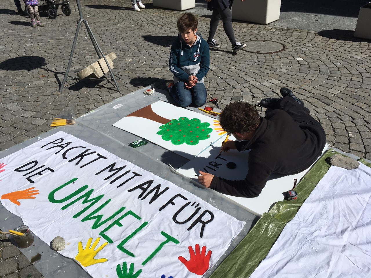 Am Samstag, den 8. Mai hat die Umweltgruppe Gonzen auf dem Kirchplatz währen des Wochenmarkts Plakate und Flyer für den Umwelt-Umzug am 21. Mai verteilt. Bei strahlendem Sonnenschein hatten wir viel Spass beim Malen und sind mit Leuten ins Gespräch bekommen: Kinder haben begeistert mit gemalt und an Reaktionen war zwischen "Grossartig, ich wusste gar nicht, dass es hier in der Gegend auch etwas gibt" bis hin zu "der Klimawandel ist nicht unser grösstes Problem" alles dabei. Ausserdem haben wir gleich einen Gemeinderat für den 21. Mai rekrutiert! Jetzt freuen wir uns auf Freitag.
